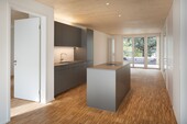 Für die Konstruktion der Geschossdecken wurden Hohlkastenelemente mit einer Spilttfüllung und Mineralwolle im Deckenelement gewählt. Diese Holzdecken bleiben in den Wohnungen sichtbar und verleihen den Räumen eine angenehm wohnliche Atmosphäre. Auch schalltechnisch schneidet die Konstruktion sehr gut ab. Akustikmessungen beweisen, dass in diesem Gebäude die erhöhten Anforderung eingehalten werden. Das zeugt einerseits von einem guten Aufbau der Decke, andererseits von einer sauberen Ausführung der Bauarbeiten. Wenn Gebäude ringhörig sind, ist das oft auf eine mangelhafte Ausführung zurückzuführen. Denn der Schall sucht sich seine Wege über undichte Fugen, zu tief eingeschlagene Verbindungsmittel oder falsch eingebaute Stellstreifen von Unterlagsböden.