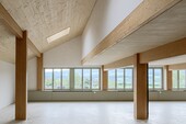 Das Bürogebäude ist ab dem Erdgeschoss vollständig als Holzbau konzipiert, inklusive des gekapselten Treppenhauses und des Liftschachts. Um das Raumklima zu verbessern und die Geschichte des Bauplatzes als Ziegelei sichtbar zu machen, wurde der Treppenkern mit ungebrannten Lehmziegeln ummauert. Der Gewerbebau vereint vielfältige Nutzungen wie Werkstätten, Lagerräume und Büros unter einem Dach. In der 8 Meter hohen Werkstatt ist ein 10-Tonnen-Kran auf einer Kranbahn aus Baubuche installiert. Das Flachdach beherbergt eine grosse Photovoltaikanlage mit 1300 m², die nachhaltige Energie erzeugt. Das Projekt verbindet moderne Holzbauweise mit historischen Elementen und nachhaltiger Energiegewinnung.