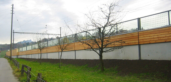 Die Verbundsicherheitsgläser sind mit einem Siebdruck zum Schutz der Vögel versehen. Die Wand selber besteht aus einer geschlossenen Schalung auf der Anwohnerseite, einer kesseldruckimprägnierten Rahmenkonstruktion sowie einer Mineralwolldämmung, die schliesslich mit einer zementgebundenen Holzwollplatte abgedeckt wird. Lediglich aus ästhetischen Gründen wurde zusätzlich eine Lamellenschalung vorgehängt. Der Abschnitt der Lärmschutzwand zwischen Bahnlinie und Hauptstrasse ist beidseitig absorbierend und hilft mit, den Bahnhofsplatz neu zu gestalten.