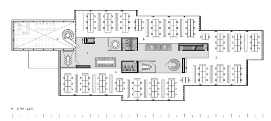Ils ont conçu le bâtiment comme un pavillon isolé dans l'espace paysager. paysage nouvellement aménagé. Avec ses deux étages, il se trouve à l'ombre du paysage mouvementé du toit du bâtiment principal. Chaque poste de travail a une relation étroite avec le paysage. relation productive avec le paysage environnant, et même depuis le premier étage il existe une proximité immédiate avec l'espace du jardin. La structure en bois visible souligne le lien matériel direct avec le versant fortement boisé du site. au nord du site.