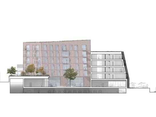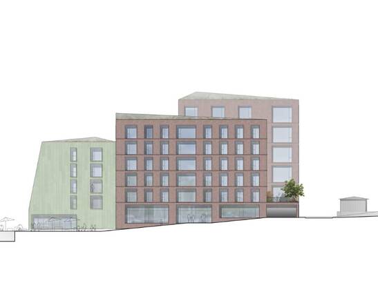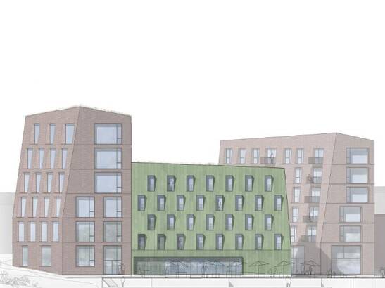Les deux bâtiments arrière s'intègrent tranquillement dans le contexte avec leur façade en briques, tandis que les architectes ont donné un accent particulier au bâtiment avant. D'un point de vue conceptuel et durable, ils ont opté pour une façade en cuivre recyclé. Une partie aussi importante que possible doit être constituée de cuivre recyclé, qui se densifie à des degrés divers en fonction de la disponibilité actuelle et est complétée, le cas échéant, par de nouveaux panneaux.