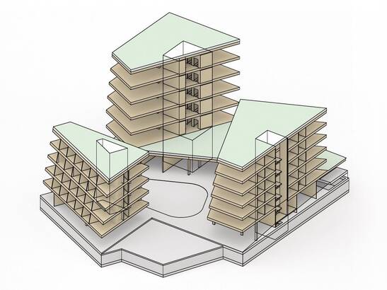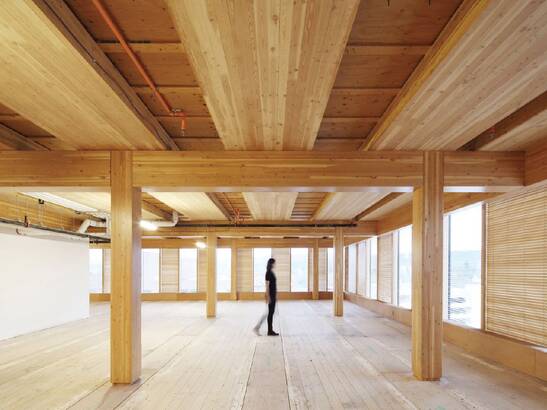 Les plans d'ensemble comportent des structures porteuses de plafond à un axe pour des poutres à deux ou trois travées. On obtient ainsi des portées allant jusqu'à sept mètres. Les plafonds en bois lamellé-croisé s'avèrent être la meilleure solution. Grâce aux lamelles de planches collées en croix, les plafonds présentent une plus grande rigidité transversale, ce qui est important pour la stabilité du bâtiment ainsi que pour le comportement vibratoire des plafonds à grande portée.