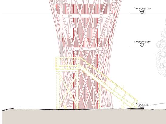 La structure portante de la tour se compose de barres de mélèze croisées et assemblées en un treillis hyperbolique. Ce type de construction assure une grande stabilité structurelle, favorise un drainage ciblé et s'intègre harmonieusement dans le paysage naturel de la plaine alluviale. Deux plateformes d'observation situées à huit et douze mètres de hauteur offrent des vues impressionnantes sur la Thur et la nature environnante.