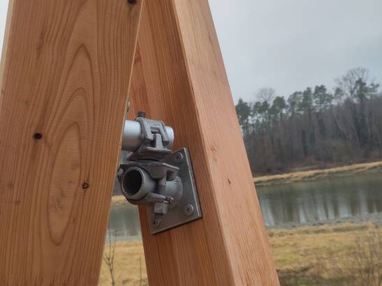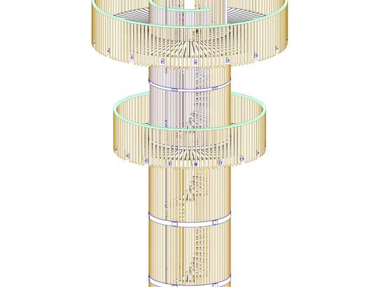 La tour se distingue par son intégration esthétique dans les rives de la Thur et par son innovation technique. En tant que membre de l'équipe de Timbatec, Marcel Muster était responsable de la statique d'exécution. Du point de vue technique, la liaison des piliers inclinés par un collier d'échafaudage flexible et pivotant est particulièrement passionnante. Malgré des angles différents, nous avons ainsi pu trouver une solution uniforme et facile à monter pour la structure en treillis : stable, efficace et élégante.