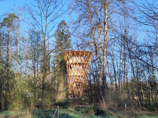 La tour d'observation construite en bois dans les zones alluviales de la Thur permet non seulement d'observer la nature à grande échelle, mais offre également une vue panoramique magnifique sur la région des zones alluviales de la Thur. De plus, elle est elle-même un point de mire architectural ! Avec une hauteur de 15 m, c'est probablement le plus grand projet de #hallowasser et certainement le plus haut. La tour a été conçue par Jan Hess dans le cadre de son travail de master en ingénierie civile à l'EPF de Zurich.