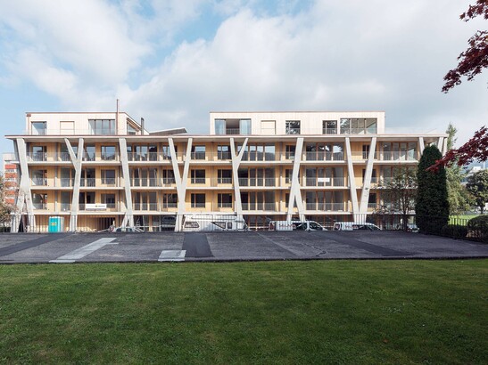 est totalement dissocié du cube en bois sur le plan statique. Les tonnelles sont soutenues par des piliers en béton incurvés qui rappellent des troncs d'arbre. Le bâtiment d'habitation est une construction en bois. Les murs intérieurs en panneaux de bois massif sont porteurs et raidisseurs. Tout le contreventement horizontal a donc été résolu par la construction en bois, c'est-à-dire par les murs intérieurs, et non par un noyau en béton comme c'est souvent le cas. La construction résidentielle peut également se passer de poutres métalliques. Tout le bois utilisé pour Arborea provient de Suisse. La façade est en bois non traité de sapin blanc de l'Emmental, les cadres des fenêtres sont en mélèze et ceux des fenêtres coupe-feu en chêne. L'enveloppe du bâtiment est très bien isolée. La conception et les matériaux de la façade favorisent l'utilisation passive de l'énergie solaire. Des capteurs solaires couvrent presque entièrement le toit plat et fournissent à l'immeuble d'habitation l'énergie résiduelle nécessaire.