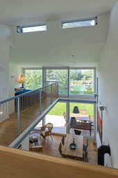 Comme les maîtres d'ouvrage ne voulaient pas seulement voir l'eau depuis la salle à manger et le salon, mais aussi depuis leur lit, l'architecte Finn Erschen a décidé d'aménager un deuxième étage dans la maison de bain de six mètres de large. L'espace de couchage se trouve au deuxième étage et est ouvert sur le salon et la salle à manger du rez-de-chaussée. La forme extérieure du bâtiment résulte du souhait des maîtres d'ouvrage de pouvoir regarder les champs vers le sud-est. Parallèlement, l'architecte souhaitait placer la fenêtre en dessous du faîte afin d'éviter la surchauffe estivale et d'exploiter les possibilités offertes par les règles d'urbanisme.