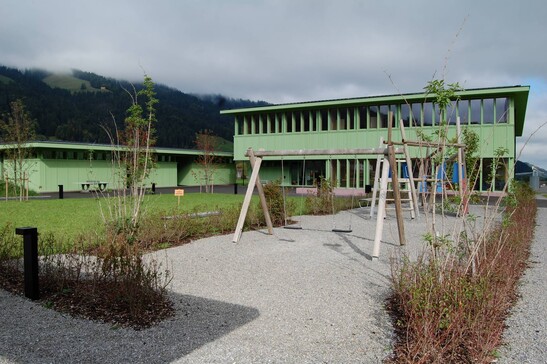 Le sous-sol du bâtiment scolaire est construit en dur, à partir du rez-de-chaussée, les deux bâtiments sont entièrement réalisés en bois. Des plafonds nervurés en bois ont permis de réaliser les grandes portées allant jusqu'à 8,5 mètres tout en intégrant entre les poutres l'acoustique et la distribution des installations techniques. L'aspect des nervures est ainsi visible. La hauteur de la pièce est perçue comme plus élevée et la hauteur des éléments de construction a pu être maintenue à un niveau relativement bas.