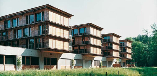 Des panneaux en matériau dérivé du bois posés à plat sur chaque étage transmettent les forces horizontales aux murs. La dérivation des forces du vent dans les fondations est assurée par un revêtement des deux côtés des murs extérieurs avec des plaques de plâtre armé de fibres. L'efficacité des séries a pu être démontrée de manière impressionnante. Ainsi, pour le type de mur apparu 104 fois, 2 pièces ont été fabriquées le premier jour et 12 le dernier jour. Le temps de montage était également différent. Le montage des 4 bâtiments identiques a duré 15 jours pour le premier et encore 6,5 jours pour le dernier.