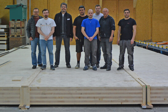 Flück Holzbau AG needed a new working platform for its new joinery plant. The platform with a size of 15 meters in length and 7.5 meters in width was recently laid out and glued by Timbatec and TS3 in the company's workshop.
