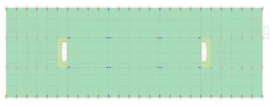 The primary structure (blue) spans the gymnasium with a width of gymnasium with a width of around 33 meters.
