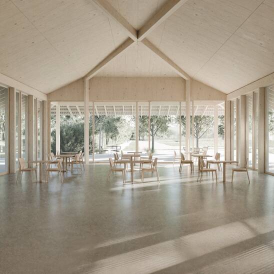 Timbatec contributed its expertise in structural engineering and timber construction concepts. From the base of the floor slabs upwards, a timber system construction in post-and-beam construction will be used. Taking into account the given room programs (restaurant, changing rooms and covered outdoor area), the design of the roof structure was a special challenge with regard to the construction and load transfer of two separate room program units, which are connected by a hipped roof construction.
