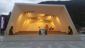 In Kirchdorf, the music pavilion is the last building block of the new educational campus. It is a free-standing solitaire visible from all sides with the stage to the south and a bus stop for the school bus to the north.The folding structure of solid wooden panels was developed from its acoustic requirements. On the one hand, the sound should be directed to the audience, on the other hand, the musicians have to hear each other in order to play together.