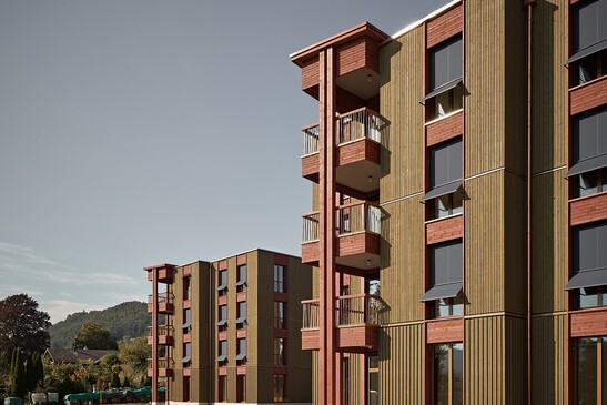 The construction project comprises two buildings, each with three upper floors, which are connected via a shared first floor. Both buildings are of timber construction, with exposed solid timber ceilings made of glulam and load-bearing interior walls made of frame construction and cross-laminated timber walls. The exterior walls are of frame construction and the bracing is provided by a solid construction staircase. The first floor combines external timber walls with a concrete ceiling. All surfaces are in exposed concrete or wood, giving the ensemble a modern, natural character.
