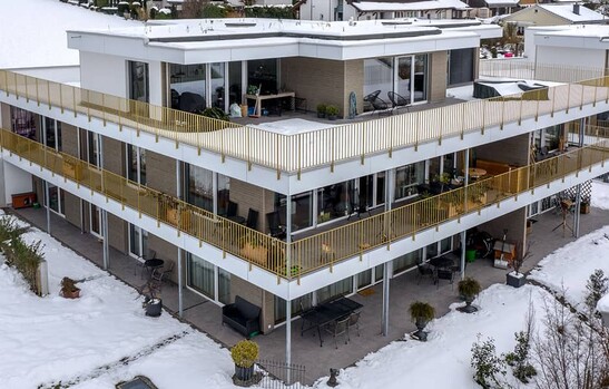 The exterior dimensions of the two multi-family buildings were adapted to the non-regular site layout. This results in irregular building footprints with sloping walls and recessed floors. The main challenge was the recessed attic floor, where the loads had to be transferred above the spacious living and dining area below. The loads could be transferred with the help of individual steel girders integrated in the floor slab.