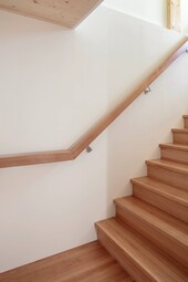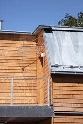 The ceilings were realized with 16 cm thick cross laminated timber elements. A form-fitting, horizontally arranged larch formwork was installed as the facade. Sufficient distance to the underlying timber frame planking ensures a sufficiently dimensioned rear ventilation cross-section. The asymmetrical roof was realized with a wooden beam construction with a rear ventilation level. For the roof terraces, the flat roof was made with cross laminated timber elements.