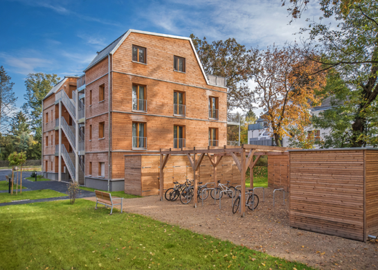 Architecturally, the materials form a symbiosis with the forest behind. The 20 residential units were built according to the KFW 40 standard and each has a balcony or terrace. The apartments of the two residential buildings can be accessed via exterior staircases and arcades.