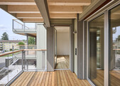 The replacement building on Breitestrasse in Wallisellen is a four-story apartment building with ten units, constructed entirely from timber elements. The timber structure stands on a concrete foundation with an underground car park. The rear-ventilated facade made of glazed fir wood combines vertical and horizontal battens and integrates a horizontal fire barrier. The stairwell is designed as an economical timber structure with encapsulated frame elements and stairs and platforms made of precast concrete.