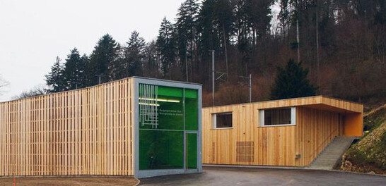 Simple columns and single, partly double main beams in the transverse direction - rafter purlins above. The administration building was constructed as a timber frame building with visible board stack ceilings. The walls also partly consist of internally visible board stacks. Ventilated formwork was mounted on top.